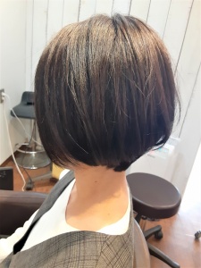 ショートベースの長さに、グラデーションにカットして、質感毛量調整をしながら、軽さと収まりを良くしています。カラーもアッシュ系ブラウンで色を入れて、超音波トリートメントもして、髪色の持続性と再現性を高めています。